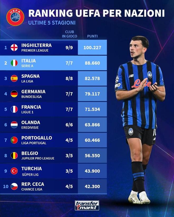 各聯(lián)賽歐戰(zhàn)積分排名:英超居首,意甲&西甲&德甲分列二到四位