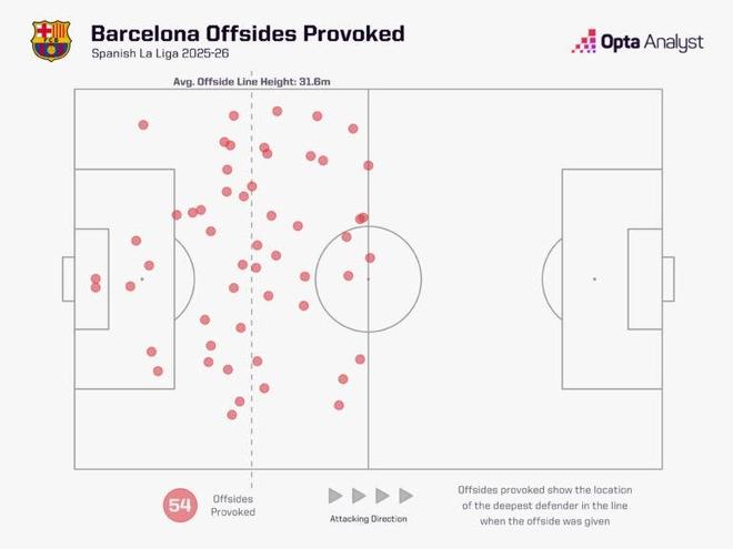 本賽季西甲賽場,巴薩制造越位的位置平均距離自家球門31.6米,相比2024-25賽季的33.8米略向內(nèi)收。上賽季,這一平均距離比西甲其他所有球隊(duì)都遠(yuǎn)出2米,位居聯(lián)賽第一;而本賽季,他們在這一數(shù)據(jù)上落后于皇馬(34.6米)和馬競(32.6米),但制造的越位次數(shù)卻分別比這兩支球隊(duì)多了46次和44次。