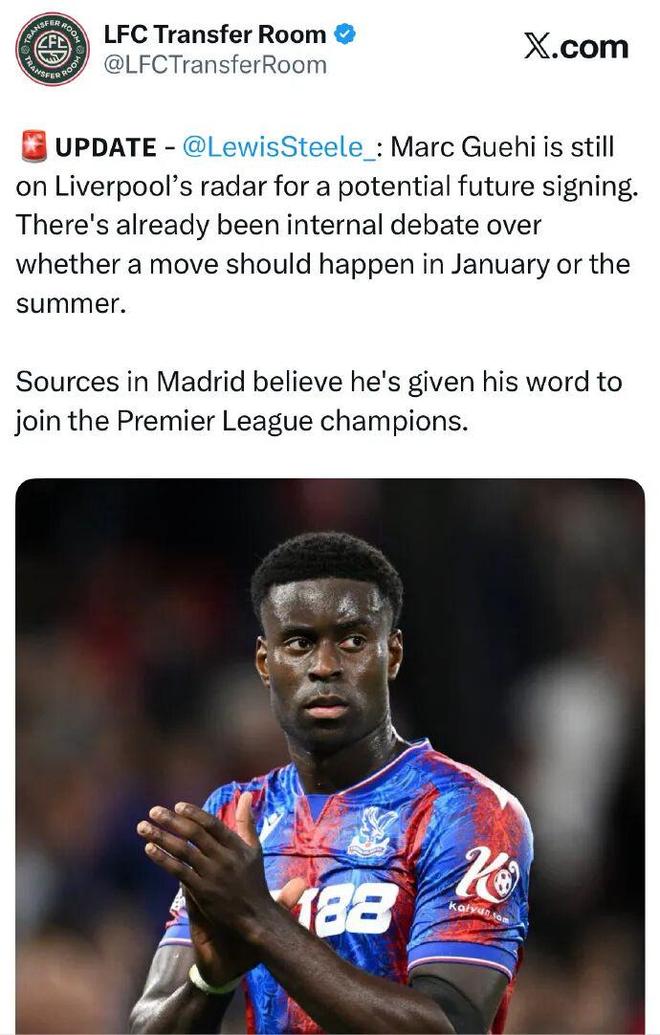 斯蒂爾:格伊仍然在利物浦的雷達(dá)上,仍可能在未來簽下他,至于轉(zhuǎn)會(huì)在1月還是夏季進(jìn)行,內(nèi)部已經(jīng)存在爭議。而來自馬德里的消息人士認(rèn)為,他已經(jīng)給了利物浦承諾。