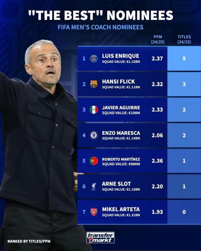 FIFA公布年度最佳男足教練候選名單的,德國轉(zhuǎn)會(huì)市場列出了入圍者上賽季的成績。