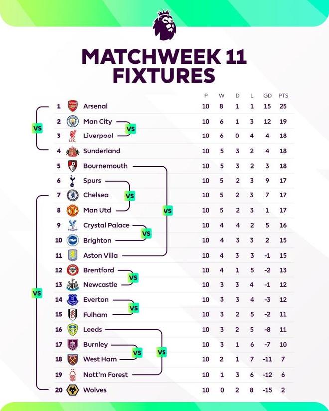 本周末將迎來英超第11輪的較量,賽前英超官方用一張圖表清晰展示了本輪交手各隊(duì)的名次對比之列的。